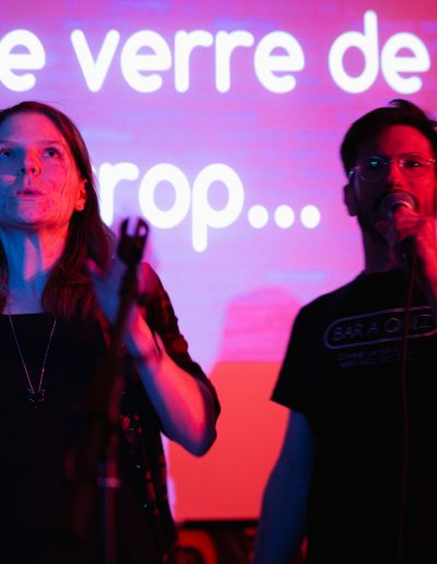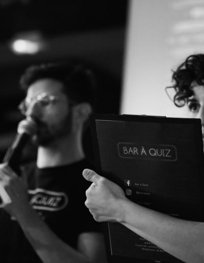 Le Bar à Quiz, c’est un peu tout cela à la fois et bien plus encore. A chaque édition, son thème. Et à chaque thème son menu de séquences dont les incontournables Apéritif de QCM, la Mixologie de blind test musicaux, les Shooters d’images / textes, le Contrôle d’alcoolémie sur papier et un final de folie avec le « 1 maître, 2 shooters »…