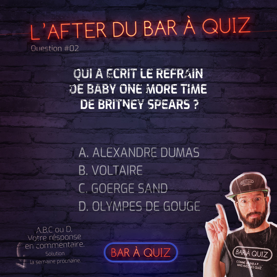 Et retrouvez chaque semaine, sur nos réseaux sociaux, une nouvelle question pour prolonger le plaisir de jouer au Bar à Quiz.